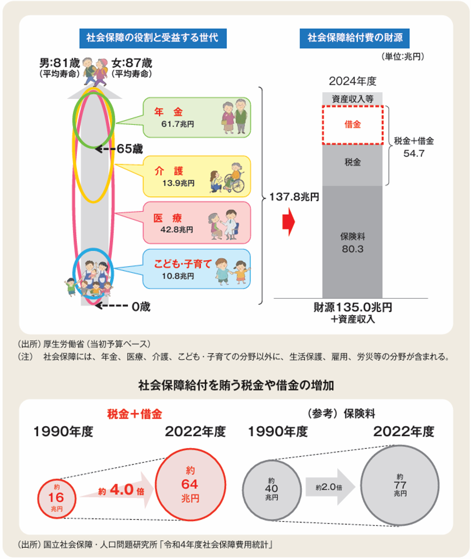 高齢化に伴い社会保障の費用は増え続け、税金や借金に頼る分も増えています。